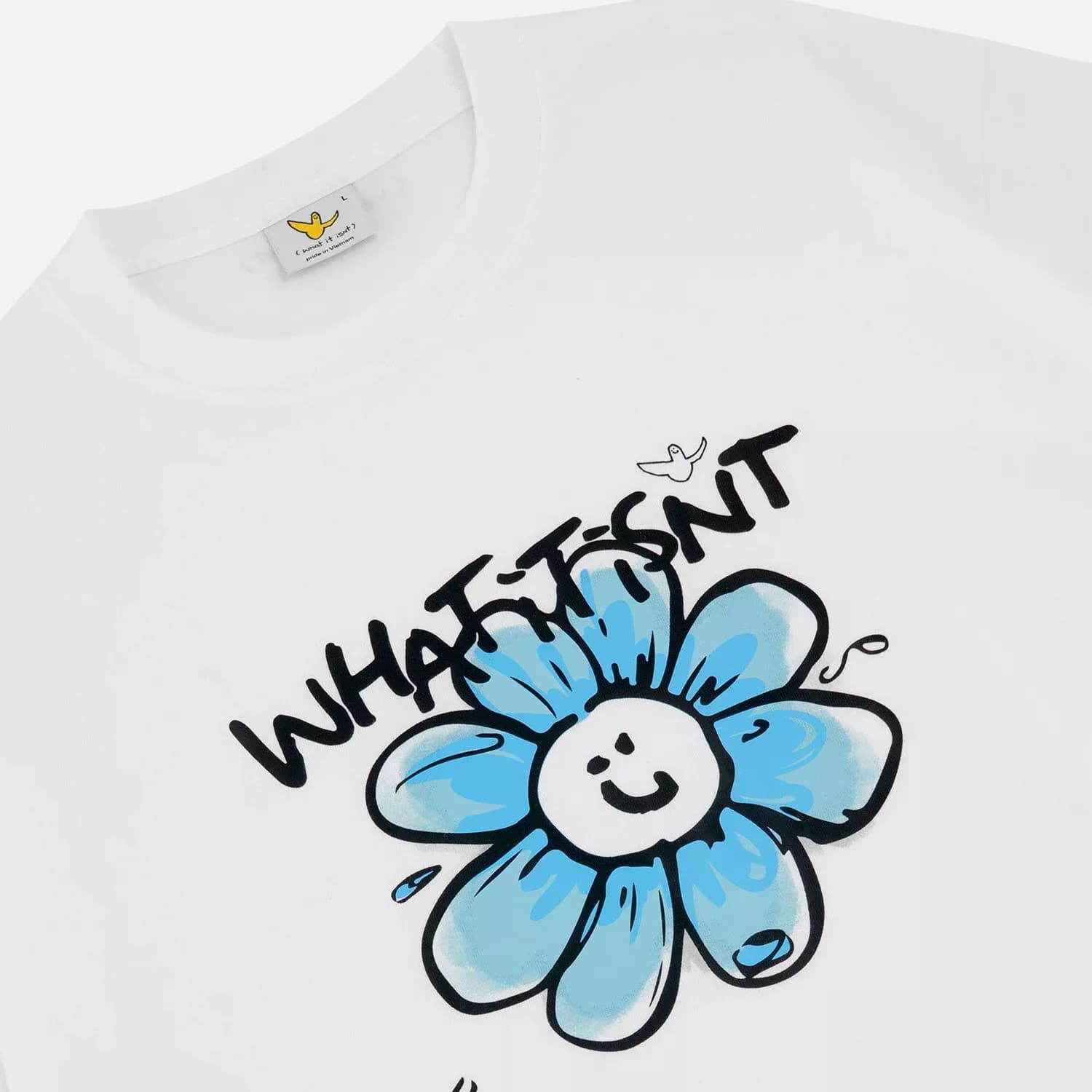 Embellished with a vibrant daisy graphic for a playful vibe.
