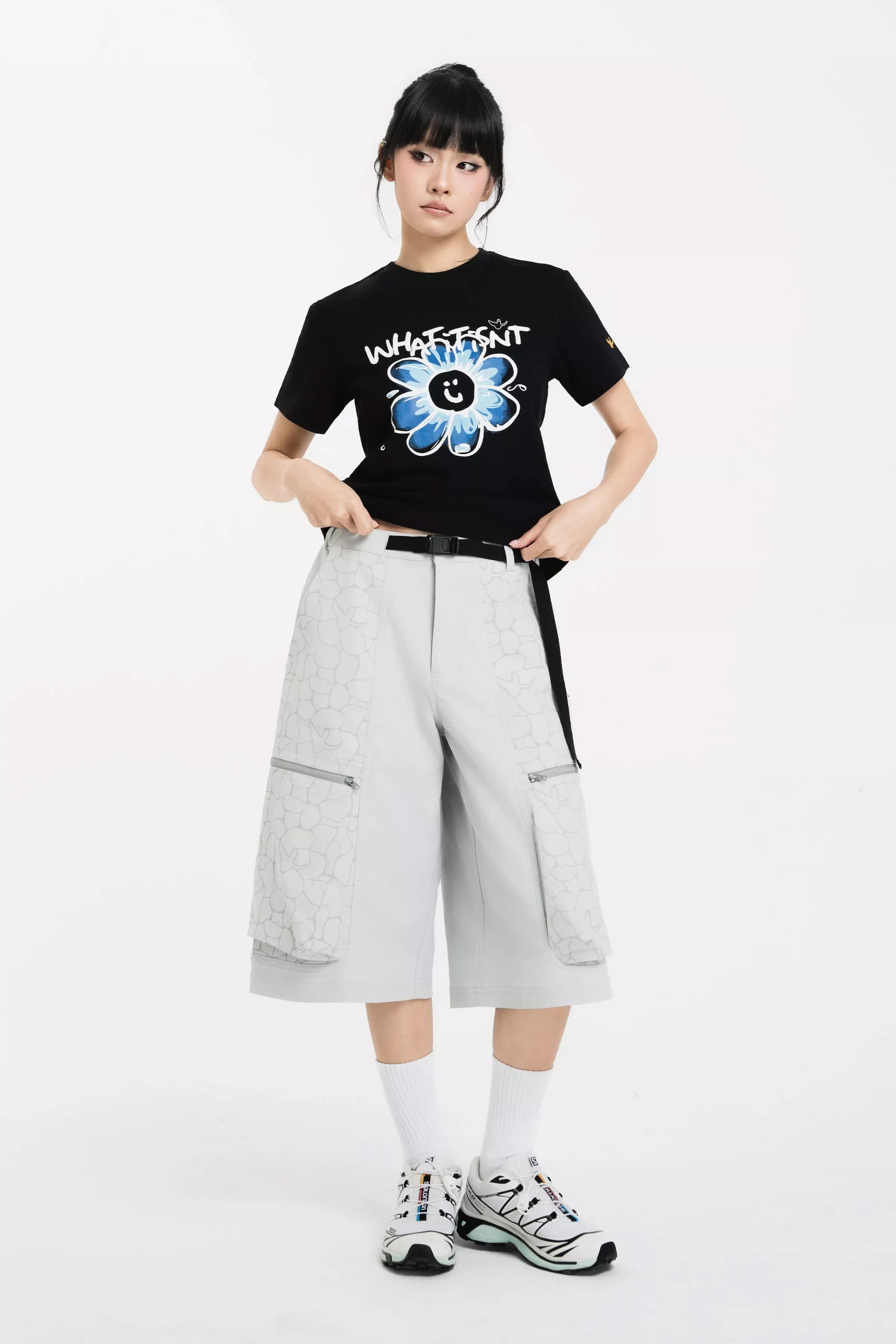 The side pockets are cleverly designed to combine storage function with a puffed effect, enhancing the overall silhouette of the garment