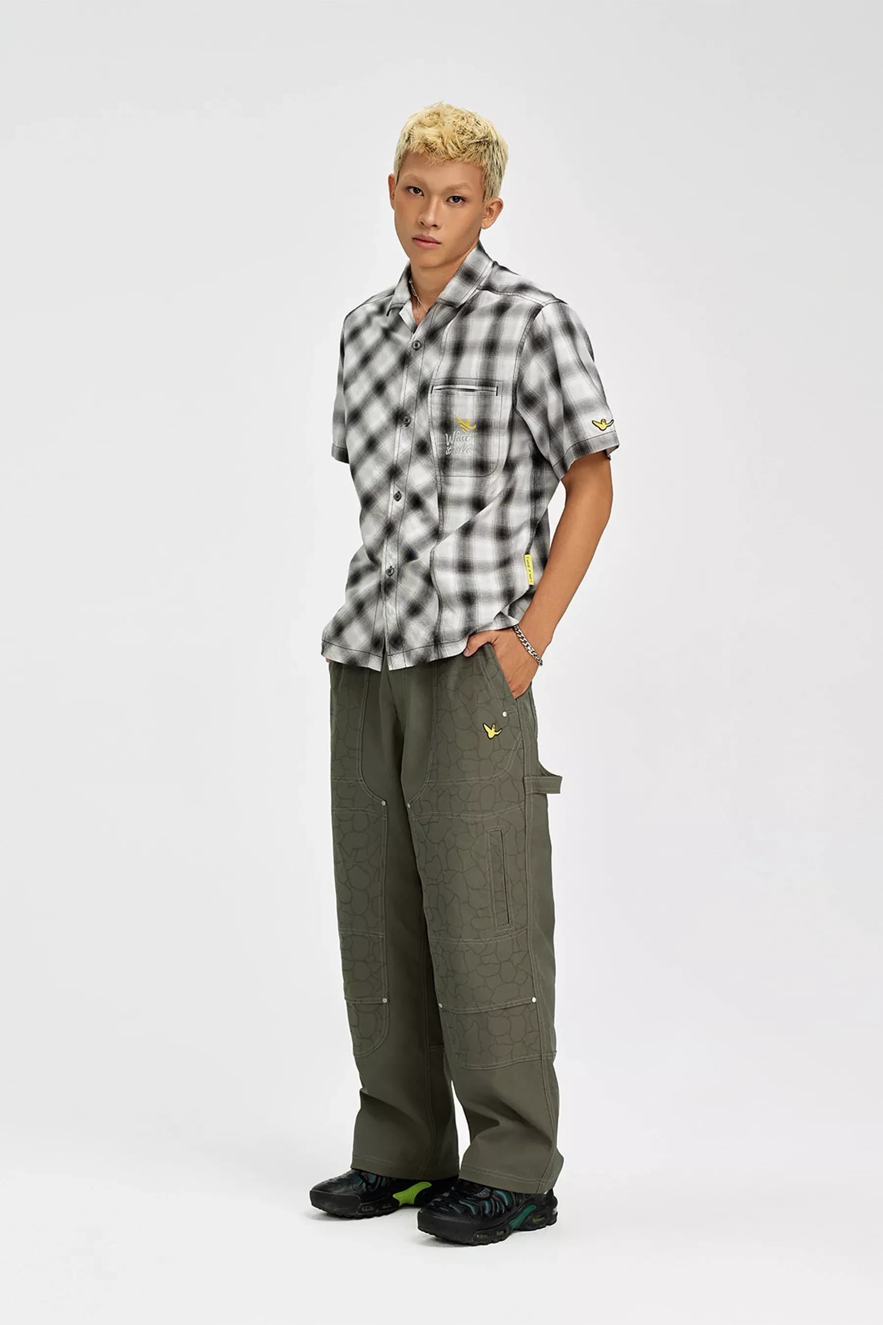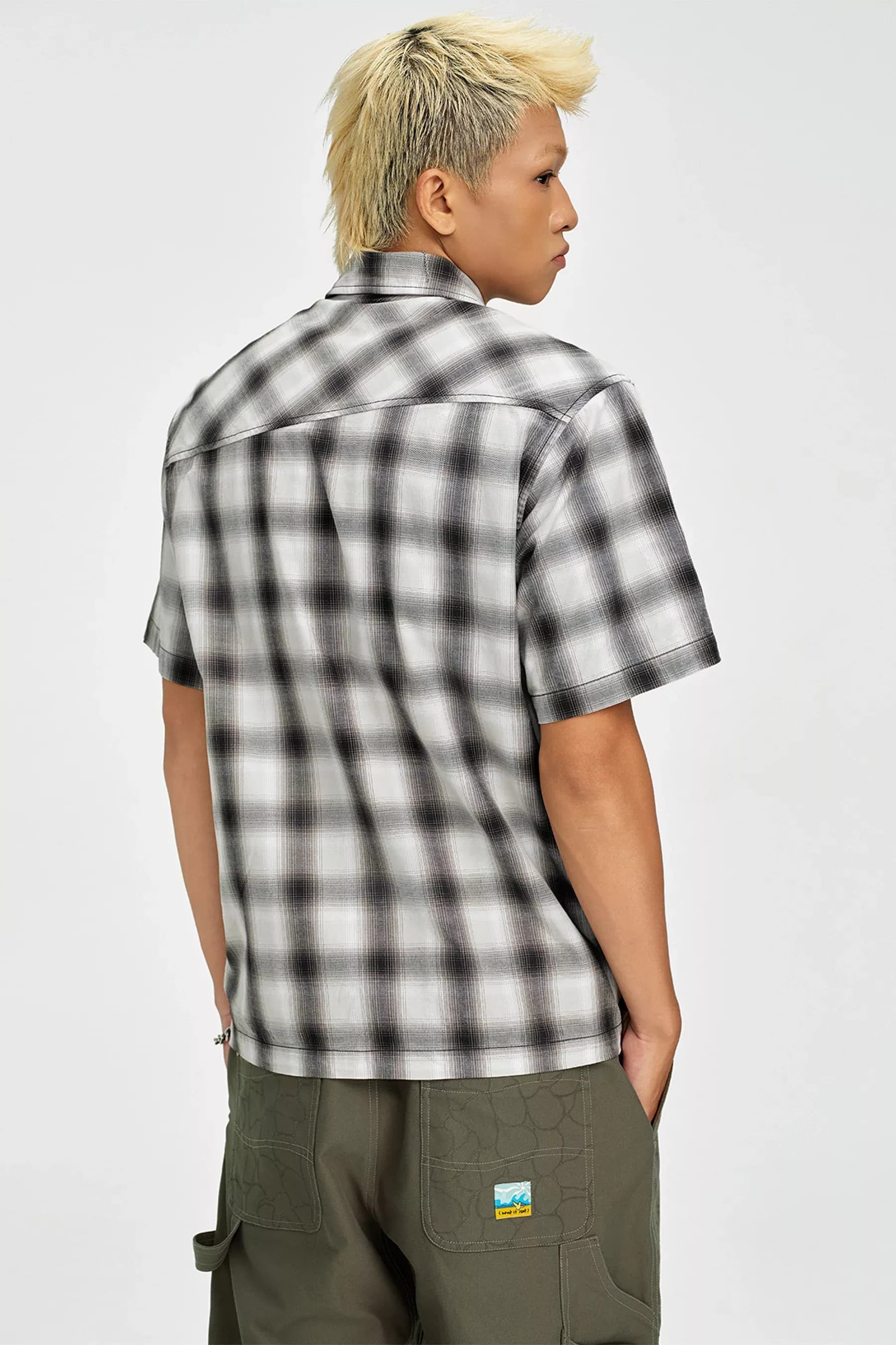 Đường cắt rã lớn giữa thân áo tạo hiệu ứng thị giác như một làn sóng chuyển động, phá vỡ sự đều đặn của họa tiết caro